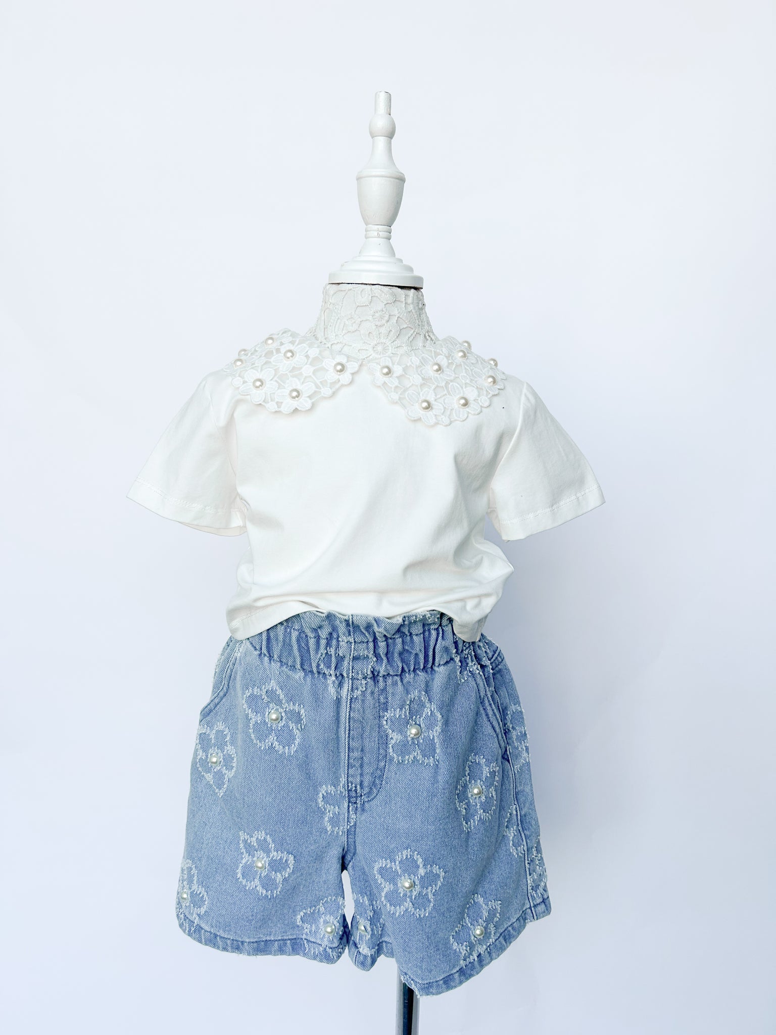 This set includes our peter pan collar Daisy Blouse and a matching pair of denim Floral Shorts! Available in size 3T