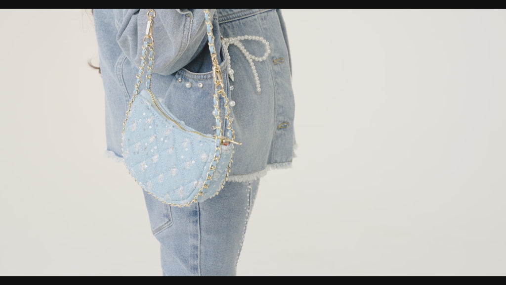 This adorable denim crescent shaped purse is perfect for your little fashionista! Ripped denim fabric with clear sequins on top, perfect for casual looks and goes perfectly with any denim outfits! Available in 3 colors!