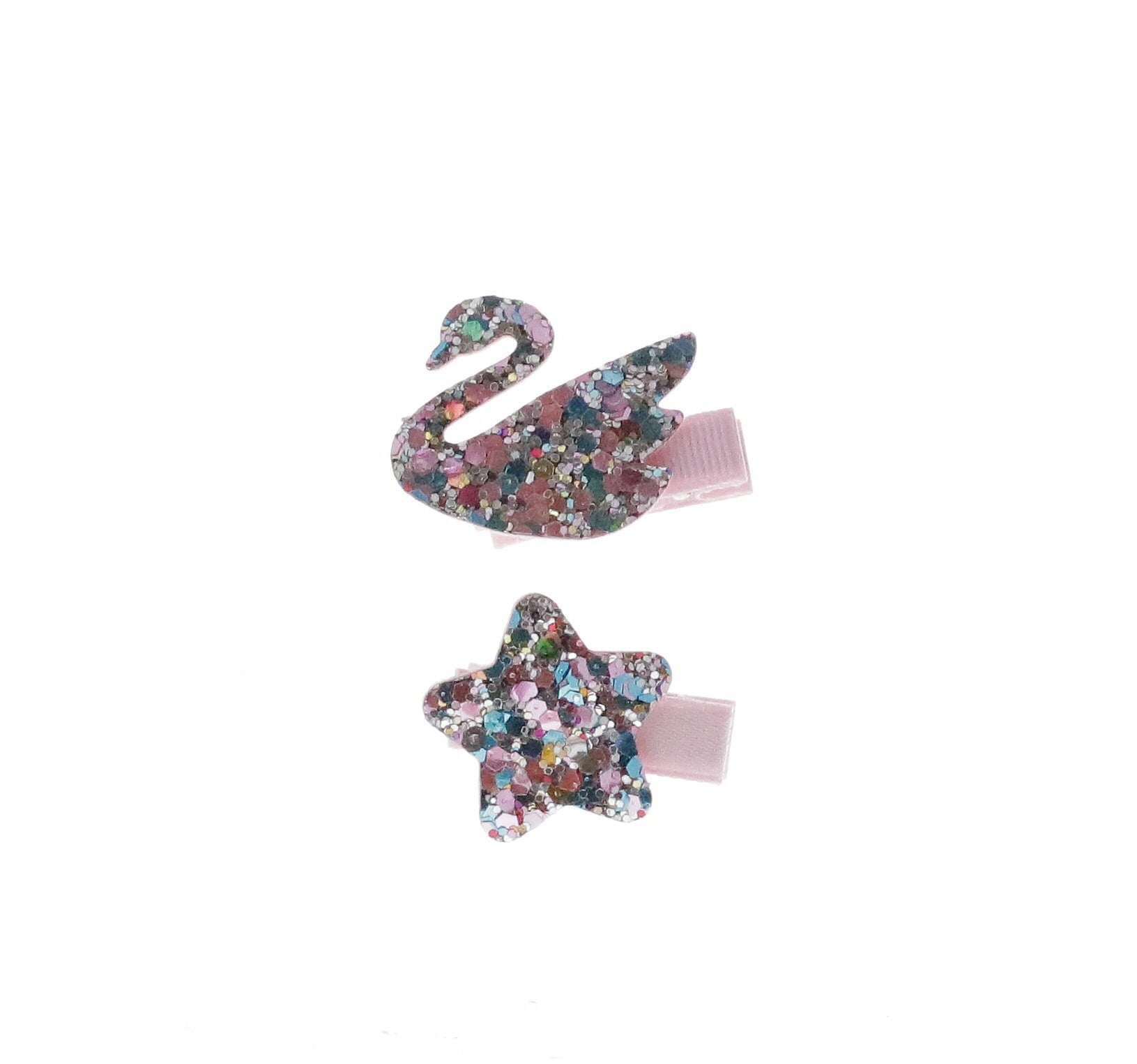 Elevate your little one's look with this enchanting duo of glittered accessories! Featuring a graceful swan and a sparkling star, this hair clip set brings whimsy and shimmer to every hairstyle. Perfect for adding that extra dash of magic to everyday wear or special occasions.